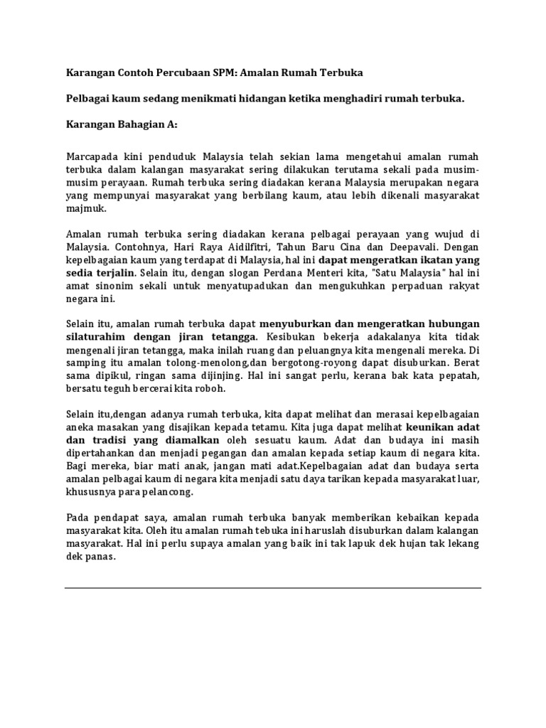 Amalan rumah terbuka sudah menjadi lumrah dalam kalangan masyarakat malaysia. So please help us by uploading 1 new document or like us to download Rakyat malaysia juga membaca kerana aktiviti ini merupakan sumber hiburan, motivasi, memenuhi tuntutan akademik, menenangkan fikiran dan bagi orang yang mempunyai empati lebih mudah memahami orang lain, tidak mudah berprasangka buruk, lebih bertolak ansur dan bersifat terbuka. Rakyat malaysia sentiasa meraikan hari perayaan tersebut kerana kita percayai bahawa biar mati anak, jangan mati adat. Kemeriahan berganda apabila mereka bukan sahaja mengunjungi lokasi keramat itu untuk sambutan rumah terbuka.